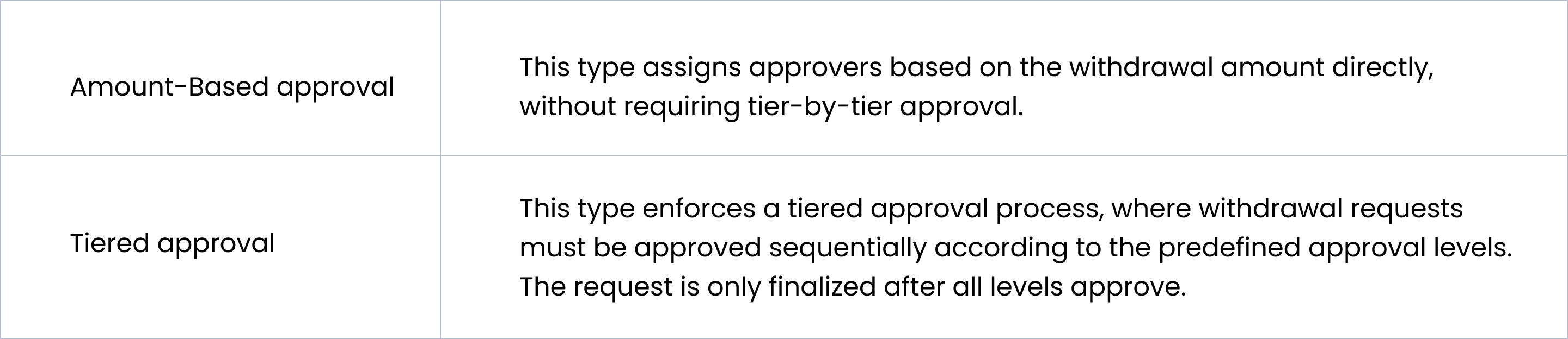 You can select the withdrawal types you wish to configure. Then simply edit the withdrawal threshold, select the approver, adjust any additional options, and click "Save" to apply your changes.