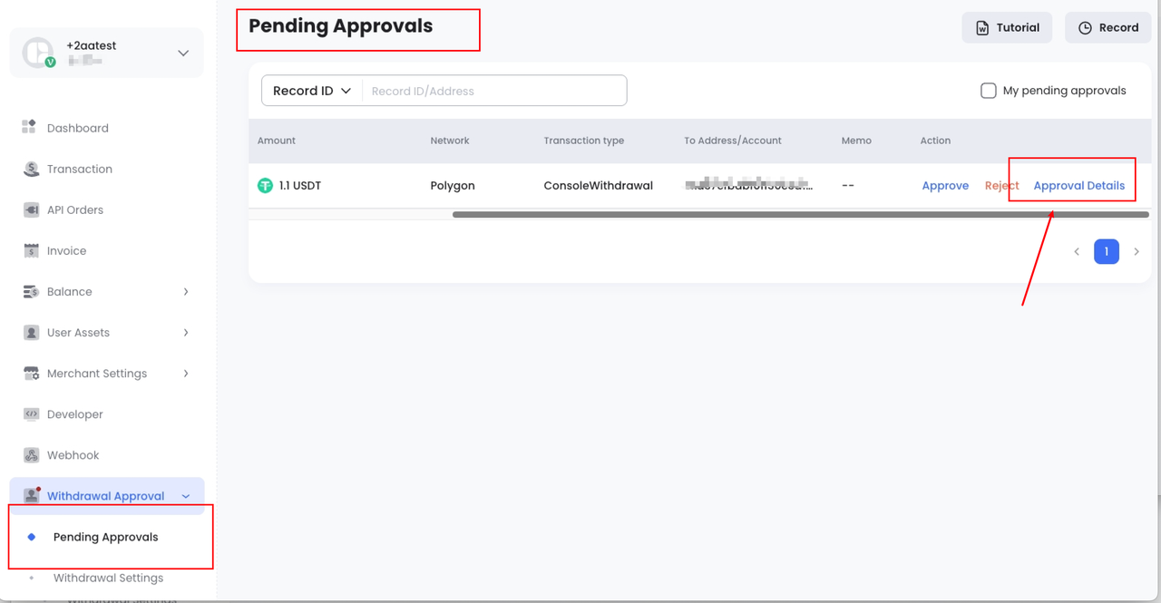 - To Approve: If the withdrawal request looks valid, click the Approve button. This will trigger the transfer of funds to the receiving address. You can check the "My Pending Approval" box to view requests awaiting your action.